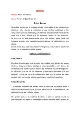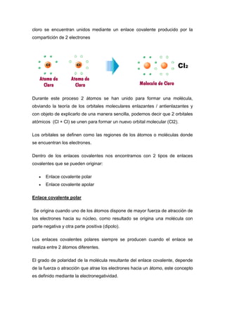 Este documento describe los diferentes tipos de enlaces químicos, incluyendo enlaces iónicos, covalentes y metálicos. Un enlace químico es la fuerza que mantiene unidos los átomos en las moléculas. Los enlaces iónicos involucran la transferencia de electrones entre átomos, mientras que los enlaces covalentes involucran el compartir de electrones. Los enlaces metálicos mantienen unidos los átomos de metales a través de electrones libres que rodean los núcleos ató