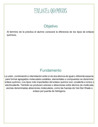 Este documento describe una práctica de laboratorio sobre los diferentes tipos de enlaces químicos. Explica los enlaces iónico, covalente y metálico, e incluye una tabla con los resultados de experimentos que identificaron estos enlaces mediante la conductividad eléctrica de varias sustancias en solución. Los estudiantes concluyeron que las sustancias con el mismo tipo de enlace son solubles entre sí, mientras que sustancias con enlaces diferentes no lo son.