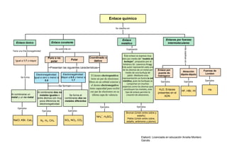 Este documento clasifica los diferentes tipos de enlaces químicos, incluyendo enlaces iónicos, covalentes, metálicos e intermoleculares. Describe las características de cada tipo de enlace, como la electronegatividad de los átomos involucrados y los ejemplos comunes de cada uno. También explica el modelo de "burbujas" para representar el enlace metálico.