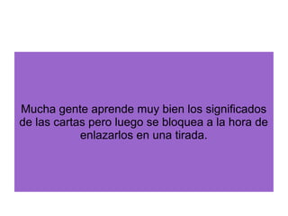 El documento explica cómo enlazar los significados de las cartas del tarot para interpretar una tirada. Sugiere ver las cartas como una historia en lugar de de forma aislada y confiar en la intuición para encontrar significados alternativos si los conocimientos previos no encajan. A continuación, proporciona un ejemplo práctico de una tirada donde las cartas indican que los esfuerzos de la consultante serán recompensados en el amor, la persona amada es idealista y ella debe interesarse por sus ideales para despertar su interés.