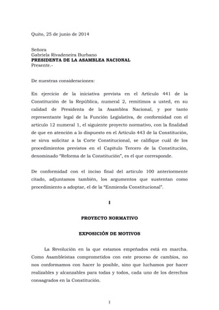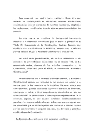 Este documento presenta 13 propuestas de enmienda a la Constitución ecuatoriana. Fue enviado por la Asamblea Nacional a la Corte Constitucional para que determine si el procedimiento a seguir es el de enmienda constitucional. Las propuestas buscan fortalecer derechos como la seguridad social, la participación juvenil y la igualdad laboral. También proponen ajustes a competencias de organismos como la Contraloría y la Defensoría del Pueblo.