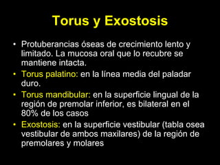 Este documento describe las características de la enostosis, una protuberancia ósea de crecimiento lento y limitado. Se define como un crecimiento localizado de hueso compacto desde la superficie interna de las corticales hacia el hueso medular. Generalmente se presenta como una lesión radiopaca, redondeada u ovalada asociada a las raíces dentarias inferiores. Histológicamente contiene hueso laminar denso sin espacios medulares. Su origen es desconocido y suele ser un hallazgo asintomá