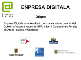 Enpresa Digitala es una iniciativa conjunta del Gobierno Vasco y las tres diputaciones forales para ayudar a las PYMEs vascas en la adopción de las nuevas TIC, promover la creación de empresas TIC, y sensibilizar sobre las ventajas competitivas de las TIC. Ofrece formación, acompañamiento e información a través de seminarios y conferencias para fomentar el uso avanzado de las TIC entre las empresas vascas.