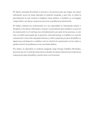 El artículo describe una entrevista con el Dr. Enrique Caballero Hernández sobre cómo estableció un nuevo canal de comunicación en la medicina a través de un artículo en el periódico El Imparcial. El Dr. Caballero comenzó a escribir el artículo en 2004 para abrir el diálogo sobre problemas de salud mental y mejorar la comunicación entre médicos y pacientes. Aunque tuvo poca respuesta inicialmente, el artículo generó discusiones sobre temas médicos que ayudaron al Dr. Caballero a informar e interactuar con el públic