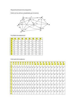 Este documento contiene las respuestas a ejercicios propuestos sobre grafos. Se presentan las matrices de adyacencia y incidencia de un grafo no dirigido, y se demuestra que el grafo es conexo, simple, pero no regular ni completo. También se muestran una cadena y un ciclo del grafo, así como un árbol generador y un subgrafo parcial. Finalmente, se analiza un grafo dirigido y se encuentran su matriz de conexión, una cadena no simple, y un ciclo simple.