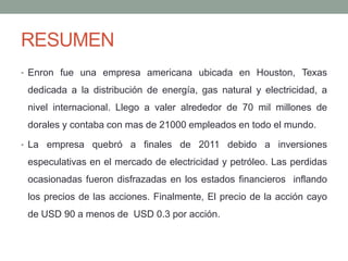 - Enron era una empresa estadounidense de energía que quebró debido a inversiones especulativas y contabilidad dudosa que ocultaba grandes pérdidas. Sus acciones cayeron de $90 a menos de $0.30 cuando se reveló el fraude. Varios ejecutivos fueron condenados.
