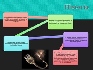 Enron era una empresa estadounidense de energía creada en 1985 tras la fusión de dos compañías. Enron se declaró en bancarrota en 2001 debido a fraudes contables y financieros realizados por sus altos ejecutivos para ocultar grandes pérdidas y hacer que la empresa pareciera más rentable. La caída de Enron perjudicó a miles de empleados y accionistas y puso de manifiesto las malas prácticas corporativas y la falta de regulación del sector energético en Estados Unidos.