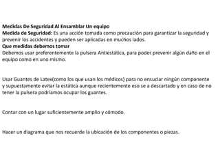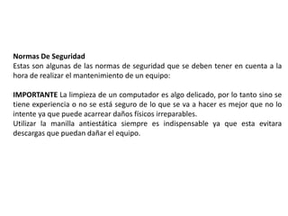Las normas de seguridad incluyen usar pulseras antiestáticas, desconectar el equipo antes de realizar mantenimiento, y tomar precauciones para evitar daños al equipo o al usuario, como no forzar piezas y dejar que el equipo se enfríe antes de tocarlo. También se recomienda ubicar el equipo en un área estable y alejada del sol, regular la energía eléctrica, y limpiar periódicamente el polvo.