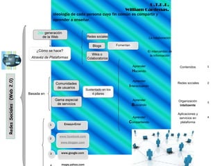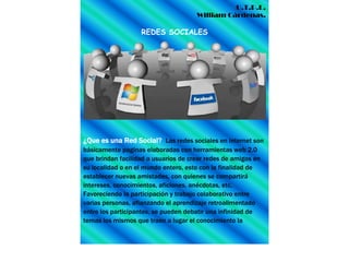 Este documento define las redes sociales como páginas web que permiten a los usuarios crear redes de amigos para compartir intereses, conocimientos y opiniones. Las redes sociales favorecen el aprendizaje colaborativo entre participantes al debatir una variedad de temas y compartir información. Algunas de las redes sociales más populares son Facebook, Twitter, YouTube y LinkedIn.
