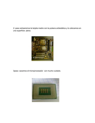 Este documento proporciona un resumen de 14 pasos para ensamblar un equipo de cómputo. Primero, se debe colocar la tarjeta madre en una superficie plana y luego insertar con cuidado el microprocesador y el ventilador de enfriamiento. Después, se instala la memoria RAM y la tarjeta madre se coloca en el gabinete. Por último, se conectan los cables de la fuente de poder, las unidades de CD y disco duro, y se cierra el gabinete.
