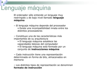 El documento describe los conceptos fundamentales de lenguaje máquina, lenguaje ensamblador y el proceso de ensamblado. Explica que el lenguaje máquina depende directamente del procesador y está formado por instrucciones máquina codificadas en bits. El lenguaje ensamblador es una abstracción del lenguaje máquina que sustituye los códigos de operación por palabras clave para facilitar su uso. El proceso de ensamblado traduce el código fuente en lenguaje ensamblador a código objeto equivalente al