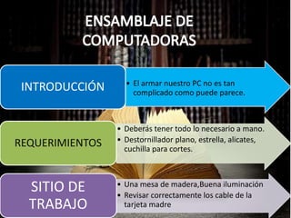 Este documento proporciona instrucciones paso a paso para ensamblar un computador personal. Explica los requisitos necesarios, medidas de seguridad y los 31 pasos para instalar componentes como la tarjeta madre, procesador, memoria RAM, unidades de disco, tarjetas de video y audio, y conectar todos los cables correctamente. El objetivo es proporcionar una guía clara y detallada para que cualquier persona pueda armar su propio PC de manera segura y efectiva.