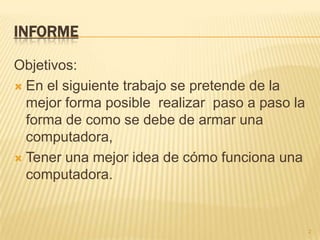 El documento proporciona instrucciones paso a paso para ensamblar una computadora. Primero se coloca la pulsera antiestática y se instalan el procesador, la memoria RAM y las tarjetas de expansión en la tarjeta madre. Luego se instalan las unidades de almacenamiento, la fuente de poder y las tarjetas de video y red. Finalmente, se conectan los cables de alimentación a los diferentes componentes para completar el ensamblaje de la computadora.