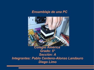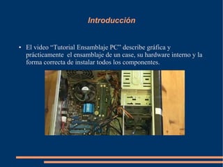 Este documento resume un video tutorial sobre cómo ensamblar una computadora personal (PC) paso a paso. Explica cada uno de los componentes necesarios como la fuente de poder, placa madre, microprocesador, lectores ópticos, memoria RAM y su correcta instalación dentro del case. Concluye que el video es una buena guía para principiantes pero podría mejorarse recomendando especificaciones de almacenamiento y formas más simplificadas de explicar el proceso.