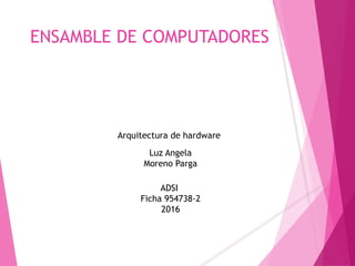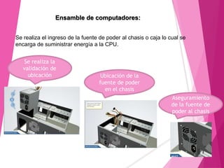 El documento describe los pasos para ensamblar un computador, incluyendo la instalación de la fuente de poder, placa base, CPU, memoria RAM, tarjeta de red, unidades de almacenamiento y periféricos en el chasis y su conexión mediante cables. La placa base conecta todos los componentes y en ella se instala la CPU, memoria RAM, disipador de calor y módulos. Luego se agregan y aseguran la tarjeta de video, unidades de almacenamiento y periféricos al chasis y se conectan mediante cables a