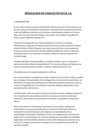 Este documento discute la resolución de conflictos en el comercio electrónico transfronterizo. Explica que la determinación de la jurisdicción competente es importante cuando los consumidores reciben bienes defectuosos. También analiza casos en los EE.UU. sobre si la mera existencia de un sitio web es suficiente para establecer jurisdicción. Concluye que se necesitan normas armonizadas aplicables a las transacciones contractuales en Internet para determinar la jurisdicción competente y la ley aplicable.