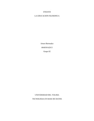 El documento discute la importancia de una educación filosófica que promueva la libertad de pensamiento y la innovación. Propone que la educación debería enfocarse en desarrollar la capacidad de pensar de forma autónoma más que en la memorización. También argumenta que los proyectos educativos que integran la teoría con la práctica permiten abordar problemas reales y fomentan el aprendizaje a lo largo de la vida.