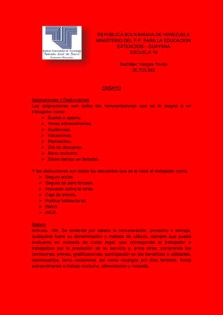 Este documento define las asignaciones y deducciones que reciben los trabajadores. Las asignaciones incluyen el salario, horas extras, vacaciones y bonos. Las deducciones incluyen seguro social, impuestos sobre la renta y ahorros. También describe la jornada laboral, incluyendo límites de 8 horas diarias y 40 semanales para trabajo diurno. Los días feriados no son días de trabajo y serán pagados a los empleados ya sea doble por trabajar o como un día normal de no trabajar.