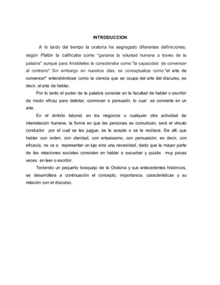 Este documento define la oratoria como el arte de convencer mediante el discurso oral. Explica que la oratoria tiene como objetivo persuadir al público para influir en sus actitudes. También describe las características de la oratoria, como el uso de vocativos y preguntas retóricas. Finalmente, concluye que aprender oratoria es importante para interactuar en la vida profesional y que los abogados necesitan dominar la oratoria para hacer triunfar la justicia en los juicios.