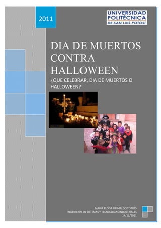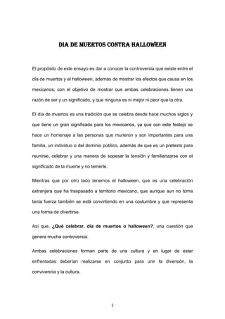 El documento compara el Día de Muertos y Halloween, dos celebraciones con orígenes similares pero significados diferentes. Aunque el Día de Muertos es una tradición mexicana rica en cultura y simbolismo, y Halloween es una celebración extranjera más reciente, el documento concluye que ambas pueden coexistir y enriquecer la cultura al promover la unión y diversión familiar.