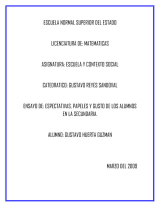 Este documento resume las perspectivas y expectativas de los estudiantes de secundaria con respecto a sus profesores, compañeros y la organización de la escuela. Explora cómo los estudiantes imaginaban la escuela secundaria antes de ingresar y cómo ha cambiado su perspectiva ahora que están en ella. También discute los roles que juegan tanto los estudiantes como la escuela y las maneras en que pueden mejorar la experiencia escolar.