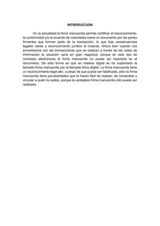 Este documento resume la ley de firmas digitales en Venezuela. Explica que una firma digital es similar a un PIN y verifica la identidad del remitente de un mensaje electrónico. Para tener una firma digital, un ciudadano debe contratar los servicios de una empresa certificadora autorizada. Aunque la ley de firmas digitales existe desde 2001, solo recientemente empresas fueron certificadas para proveer este servicio. Un documento con firma digital tiene la misma validez legal que uno firmado a mano. Las firmas digitales otorgan atributos como autenticidad, integridad