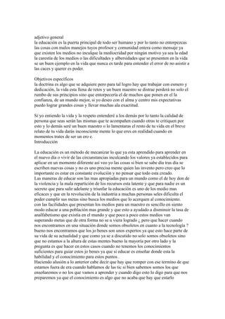 Este ensayo trata sobre la filosofía de la educación. En primer lugar, destaca la importancia de la educación como puerta principal para los seres humanos. Luego, señala que los maestros deben ser buenos ejemplos y evitar inculcar la mediocridad. Por último, resalta que la educación es un derecho y que debe brindarse apoyo psicosocial a los estudiantes para que puedan aprender de manera fructífera.