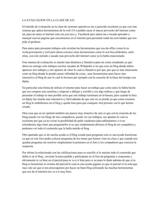 Este documento describe la evaluación en una clase de sistemas operativos que utiliza herramientas de la web 2.0. El estudiante opina que este método es excelente porque le ha permitido aprender a usar nuevas páginas web y herramientas como Box y Slideshare para presentar trabajos de forma más dinámica que sólo documentos de texto. Además, la creación de blogs donde comparten apuntes y trabajos hace que el aprendizaje sea más interesante e interactivo. El uso de estas herramientas también facilita que los estudiantes pued