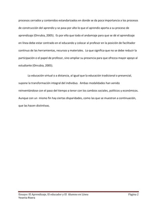 El documento analiza las similitudes y diferencias entre la educación a distancia y la educación presencial desde la perspectiva del aprendizaje, el educador y el alumno. Explica que aunque ambas modalidades buscan promover el aprendizaje, existen ciertas disparidades en cuanto al horario, la interacción, la participación de los estudiantes y el rol del educador. Sin embargo, tanto estudiantes como educadores deben desarrollar características como la autodisciplina, la motivación y las habilidades comunicativas para tener éxito