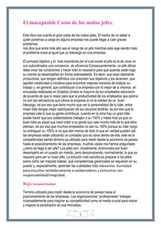 Este documento habla sobre los costos de tener malos jefes en una empresa. Explica que cuanto más alto es el rango de un jefe que es malo, mayores son los problemas y costos que causa para la empresa. También menciona que los empleados son más productivos cuando tienen un buen líder que los motiva a dar su máximo esfuerzo, en comparación con cuando reciben solo bonos. Finalmente, enfatiza la importancia de preparar a los jefes para que desarrollen las habilidades de liderazgo necesarias, como la humildad y