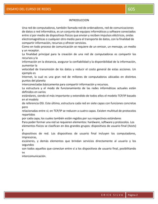 El documento presenta un ensayo sobre el curso de redes. Explica conceptos clave como las redes de computadoras, protocolos TCP/IP y OSI, elementos de una red, administración de redes, seguridad en redes, clases de direcciones IP, y creación de VLANs y su configuración en un switch y router. El autor concluye que la materia fue interesante y le dejó experiencias positivas de trabajo individual y en equipo.