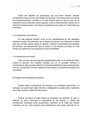 1) La declaración de ausencia es un procedimiento judicial en el que el juez, a petición de los herederos presuntivos u otras personas interesadas, otorga la propiedad de los bienes de una persona desaparecida.