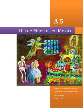 El documento habla sobre el Día de Muertos en México. Brevemente describe que esta celebración tiene orígenes prehispánicos en donde la muerte ocupaba un lugar importante en las culturas mesoamericanas. Actualmente en México, el Día de Muertos es una mezcla de celebración, convivencia y evocación de los difuntos donde se construyen altares y ofrendas con comida, flores y objetos para recibir a las almas de los fallecidos. La tradición también incluye las "calaveras", poemas que sat
