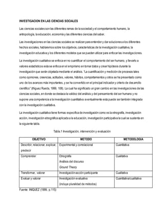 Las ciencias sociales estudian el comportamiento humano y la sociedad a través de disciplinas como la antropología y la economía. La investigación en ciencias sociales busca entender y resolver problemas sociales mediante métodos cualitativos y cuantitativos. La investigación cualitativa se enfoca en comprender las perspectivas humanas más que cuantificarlas, mientras que la investigación cuantitativa usa datos estadísticos. Métodos comunes incluyen la etnografía, investigación-acción y evaluativa.