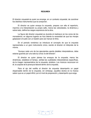 El documento presenta un ensayo sobre si es necesario el papel del director orquestal. Explica que el director es quien coordina los distintos instrumentos de la orquesta, marca el tempo y la dinámica, y define los rasgos expresivos de la obra. Aunque los músicos aportan detalles interpretativos individuales, deben guiarse por la visión del director. El ensayo también incluye un breve resumen histórico sobre el origen de la figura del director y argumenta que aunque para el público lego su papel puede parecer dispensable