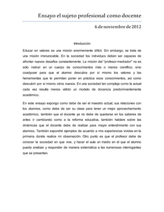 El documento describe cómo debe ser el maestro actual. Explica que el maestro ya no debe centrarse únicamente en la transmisión de conocimientos, sino que debe servir como guía para que los estudiantes descubran valores y herramientas por sí mismos. También debe usar métodos más dinámicos e involucrar a los padres. El maestro debe adaptarse a la sociedad cambiante y usar estrategias para satisfacer las necesidades de todos los estudiantes.
