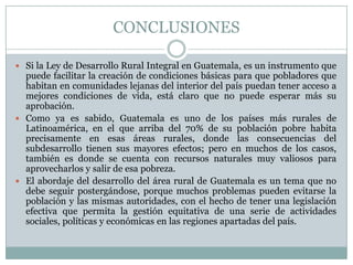 Este documento presenta conclusiones sobre una iniciativa de desarrollo rural en Guatemala. Argumenta que la ley de desarrollo rural integral podría mejorar las condiciones de vida de las comunidades rurales al facilitar el acceso a recursos y servicios. Sin embargo, la ley sigue sin aprobarse a pesar de ser una promesa de campaña. También señala algunas falacias en los artículos de la ley relacionados con la economía solidaria, políticas laborales y objetivos de soberanía alimentaria.