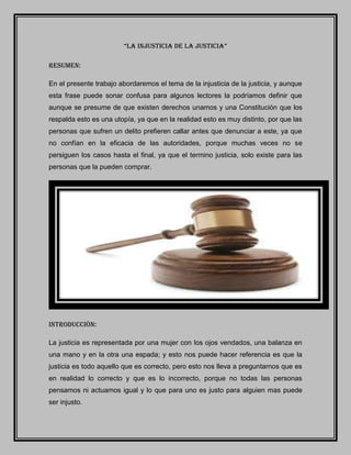 Este documento analiza el tema de la injusticia en el sistema de justicia. Aborda conceptos como justicia, injusticia y derechos, y examina casos de injusticia en procesos penales debido a la desigualdad de posibilidades para personas indígenas o pobres. También incluye un resumen del documental "Presunto Culpable" como ejemplo de injusticia en el sistema judicial mexicano y cómo las personas a veces son encarceladas injustamente debido a fallos en el proceso.