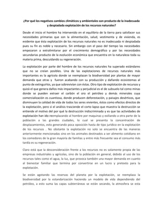 La explotación inadecuada y despiadada de los recursos naturales por parte del hombre ha causado cambios climáticos y ambientales negativos. La explotación agrícola y minera ha reemplazado la biodiversidad y dañado ecosistemas, causando deforestación y paisajes desérticos que disminuyen la calidad de vida. Además, las emisiones de dióxido de carbono de las actividades industriales, de transporte y de deforestación están calentando la atmósfera y exacerbando el cambio climático. La