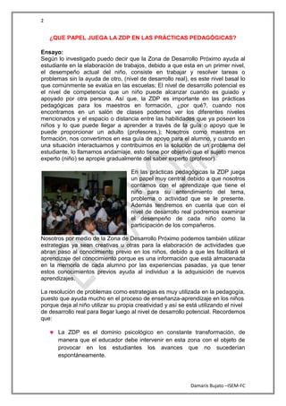La Zona de Desarrollo Próximo (ZDP) juega un papel central en las prácticas pedagógicas al permitir a los maestros examinar el nivel de desarrollo real de cada niño y utilizar estrategias que ayuden a los niños a alcanzar su nivel de desarrollo potencial. La ZDP también facilita la adquisición del conocimiento a través de la comunicación entre estudiantes y maestros. Finalmente, la ZDP tiene importancia porque implica que el nivel de desarrollo de un niño no es fijo y