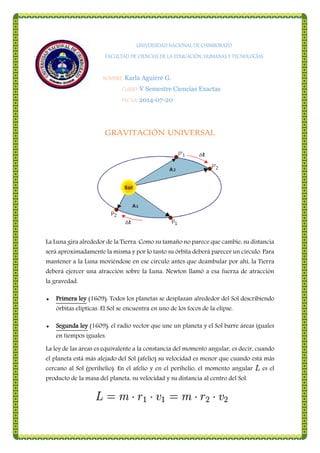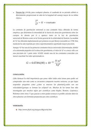 Este documento resume las tres leyes del movimiento planetario de Kepler y explica la gravitación universal de Newton. Describe cómo Newton usó la observación de que la Luna gira en una órbita circular alrededor de la Tierra para deducir que la Tierra debe ejercer una fuerza de atracción sobre la Luna. También resume las tres leyes de Kepler sobre el movimiento de los planetas y explica la constante de gravitación universal.