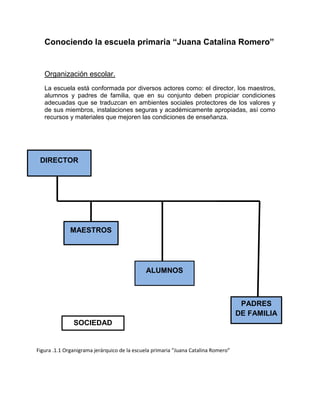 El documento describe la organización de la escuela primaria "Juana Catalina Romero", la cual está compuesta por un director, maestros, alumnos y padres de familia. La directora Vicenta Toledo Hernández supervisa al equipo escolar para lograr las metas de la escuela, mientras que los maestros enseñan a los alumnos y colaboran entre sí. Los alumnos asisten a clases y cumplen con las normas de la escuela. Los padres de familia participan en actividades como la limpieza y el comité escolar.