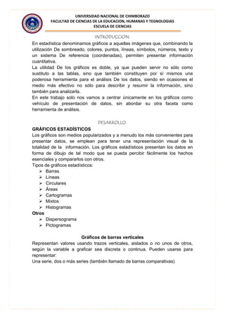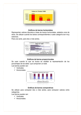 El documento describe diferentes tipos de gráficos estadísticos que se pueden usar para presentar datos de manera visual. Explica que los gráficos estadísticos muestran datos en forma de dibujos para que los hechos esenciales sean fácilmente perceptibles y comparables. Luego enumera y describe varios tipos de gráficos como barras, líneas, circulares, de áreas y cartogramas.