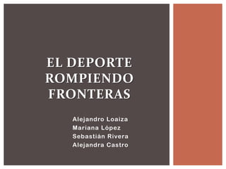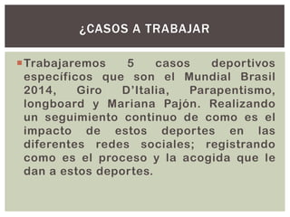 Este documento presenta un proyecto para analizar cómo 5 deportes específicos (Mundial Brasil 2014, Giro D'Italia, parapente, longboard y Mariana Pajón) se difunden a través de Internet y las redes sociales, examinando cómo son recibidos en la web, cómo la web puede afectar la asistencia a las competencias, y el tipo de información que proporciona sobre estos deportes. El proyecto analizará los casos usando herramientas como Wikipedia y redes sociales, y considerará tanto los beneficios como los problemas que la