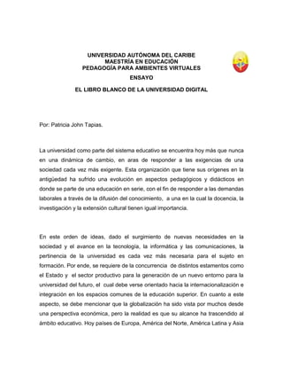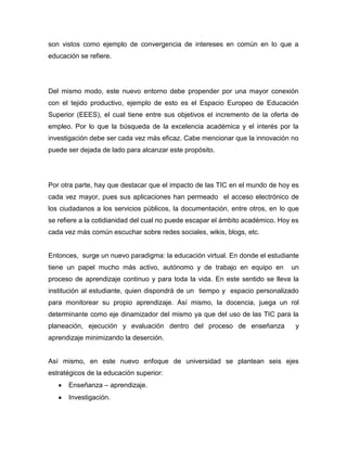 Este documento discute la necesidad de una universidad digital en respuesta a los cambios en la sociedad y la tecnología. Propone seis ejes estratégicos para la educación superior, incluyendo la enseñanza-aprendizaje, la investigación, la gestión universitaria y las TIC. Argumenta que la universidad debe satisfacer las necesidades de una sociedad en cambio permanente a través de conceptos como el aprendizaje continuo y la reutilización de la información.
