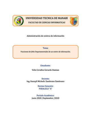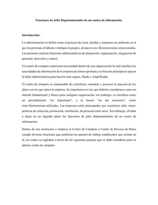 1) El documento describe las funciones de varios jefes departamentales clave en un centro de información como el jefe de desarrollo de sistemas, el jefe de servicio técnico y el jefe de consultoría técnica.