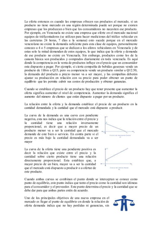 La economía de mercado se basa en la interacción entre la oferta y la demanda en los mercados, que determina el precio y cantidad de los bienes. La curva de demanda muestra que a mayor precio hay menor cantidad demandada, mientras que la curva de oferta refleja que a mayor precio hay mayor cantidad ofrecida. El punto de equilibrio donde ambas curvas se interceptan indica el precio y cantidad óptimos para productores y consumidores.