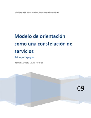 Este documento resume diferentes modelos de orientación psicopedagógica, centrándose en el modelo contemporáneo de orientación centrado en la institución educativa. Este modelo implica un equipo multidisciplinar que trabaja de forma conjunta para resolver objetivos educativos. El orientador asume un rol de consultor para los profesores. La ventaja clave es que la orientación psicopedagógica se incluye como parte integral del personal de la escuela, permitiendo una comunicación constante. Sin embargo, se requieren recursos económicos y de infraestructura significativos