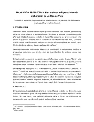 Este documento describe la importancia de la planeación prospectiva para elaborar un plan de vida efectivo. Explica que la planeación prospectiva implica reflexionar sobre uno mismo, definir objetivos y tomar decisiones anticipadas para crear el futuro deseado en lugar de dejarlo al azar. También destaca que el plan de vida debe integrar las esferas personal, profesional y social mediante el establecimiento de metas y estrategias claras. Finalmente, concluye que la planeación prospectiva es una herramienta útil para visualizar diferentes escenarios futuros y elegir la ruta