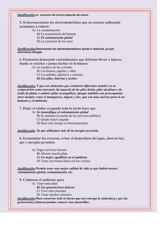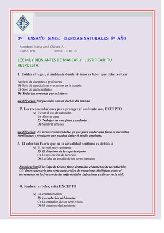 Este documento presenta un examen de ciencias naturales de 8o grado que contiene 10 preguntas sobre el cuidado del medio ambiente. Cada pregunta ofrece 4 opciones de respuesta y se pide justificar la elección. Las preguntas cubren temas como la responsabilidad de cuidar el ambiente, formas de protegerlo como sembrar árboles y reciclar, y las consecuencias del calentamiento global y el desperdicio de recursos. El examen concluye instando al desarrollo de un ensayo sobre estos temas y su publicación